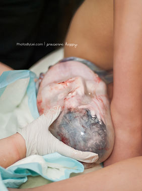 „Á þessari mynd er ljósmóðirin að losa naflastrenginn frá hálsi barnsins en hann var þrívafinn um hálsinn.“ – Leilani Rogers