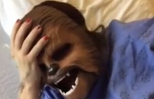 Birti myndband af sér í miðjum hríðum með Chewbacca grímu