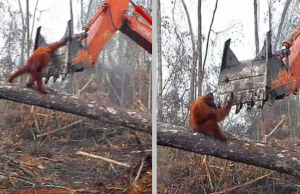 Órangútan berst við vinnuvélar – Myndband