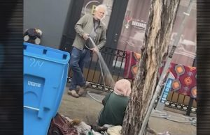 Maður sprautar vatni á heimilislausa konu – Myndband