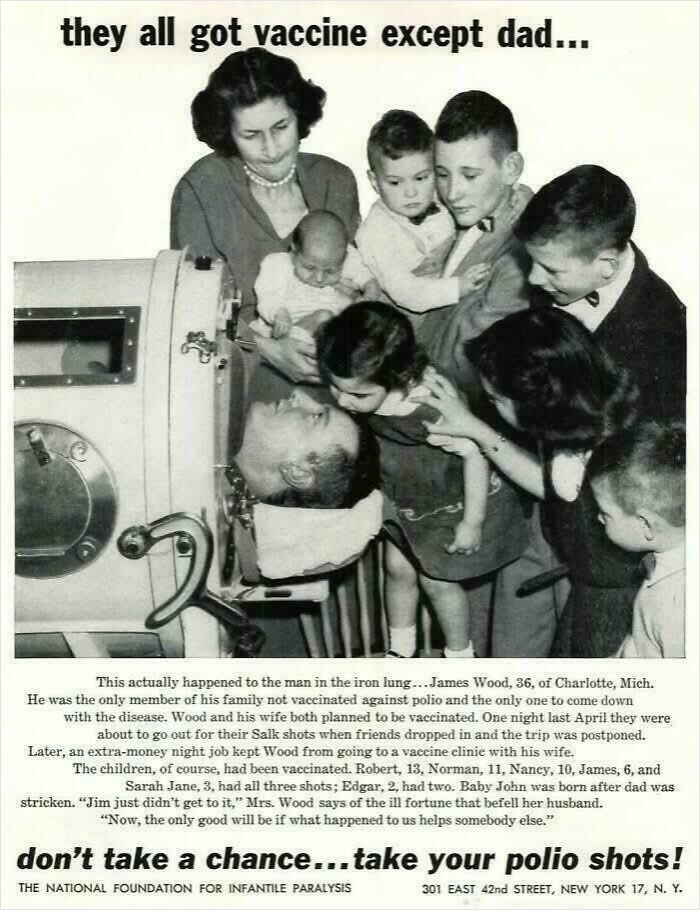 Þarna er verið að tala um bólusetningu fyrir lömunarveiki. Allir höfðu fengið bólusetningu nema pabbinn í fjölskyldunn, því það hafði ýmislegt komið uppá svo hann komst aldrei í bólusetninguna. Hann var því bundinn við „járnlunga“ sem hjálpaði honum að anda.