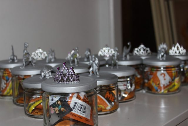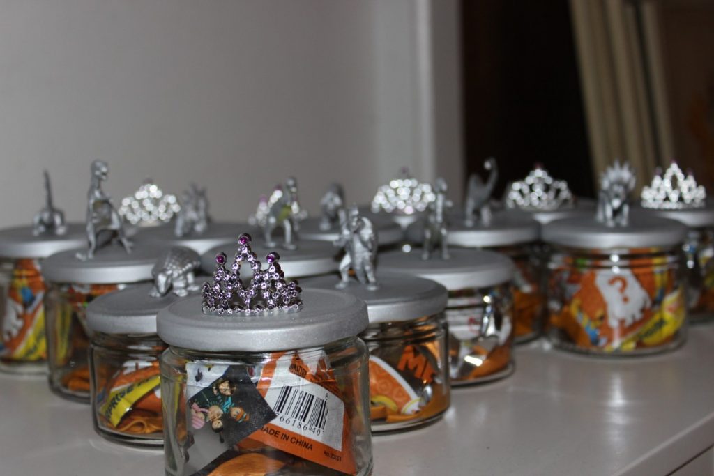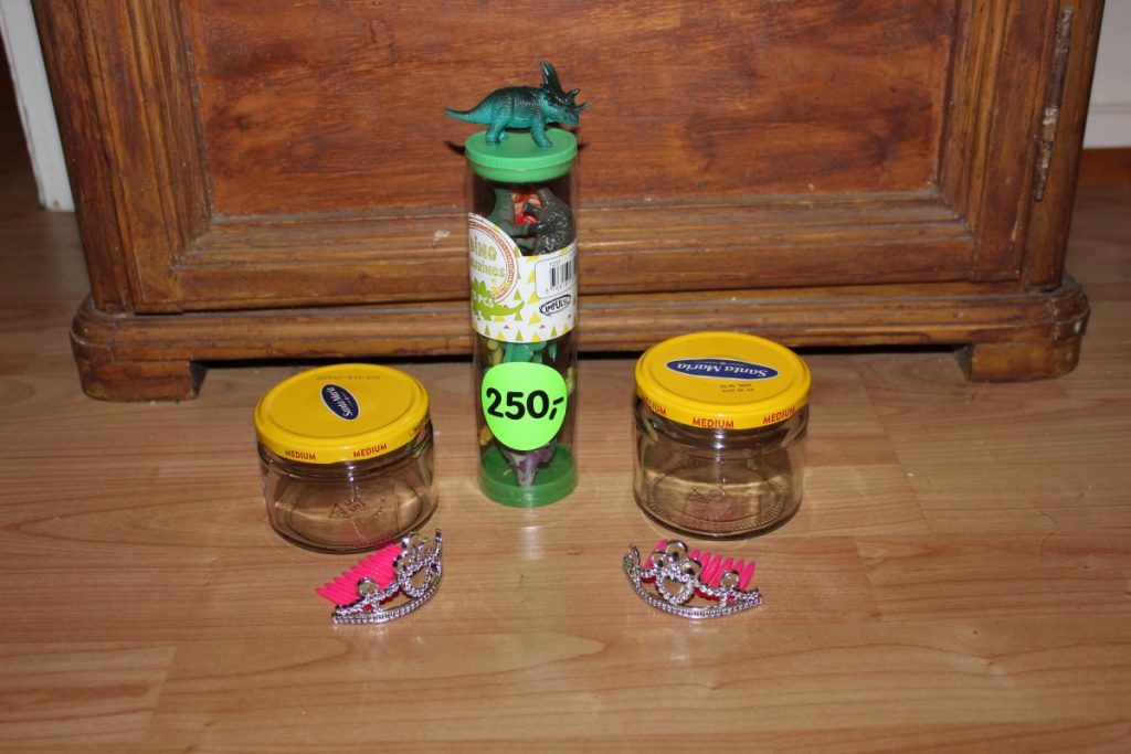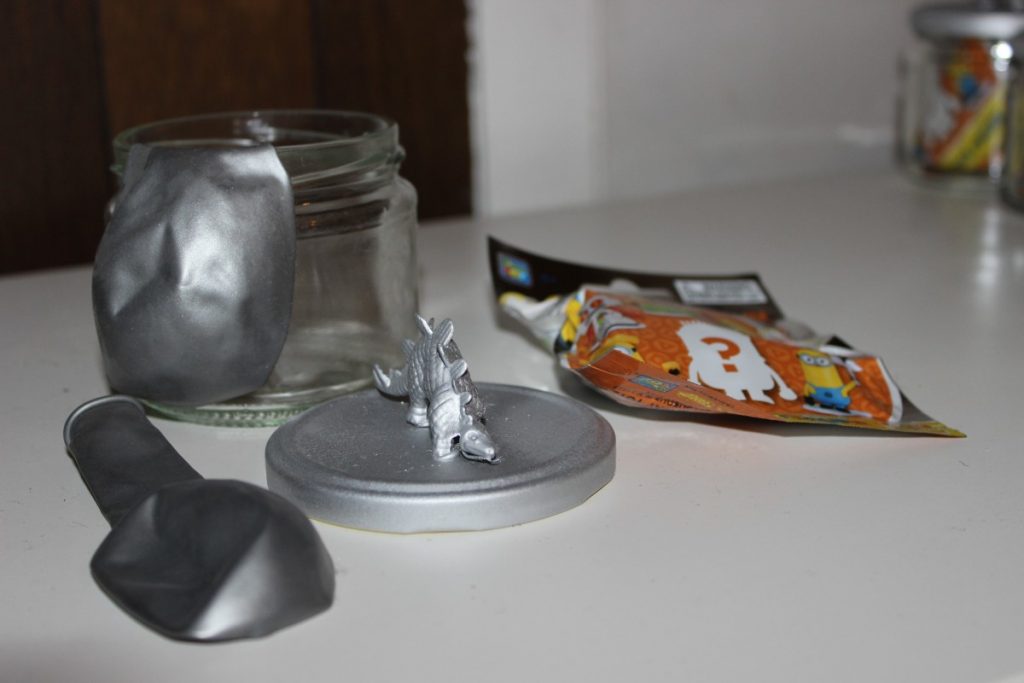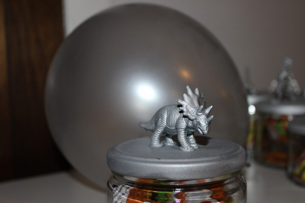 Ég keypti þennan bauk af risaeðlum en því miður voru þær ekki nógu margar fyrir allan bekkinn þannig að ég bætti við nokkrum kórónum sem ég átti í föndrinu mínu. Ég viðurkenni að það tók tíma að safna saman nógu mörgum krukkum en það tókst. Ég byrjaði svo á því að líma risaeðlurnar og kórónunar á lokin og sprayjaði allt silfurlitað. Í krukkurnar setti ég Minions óvæntan poka og blöðrur.