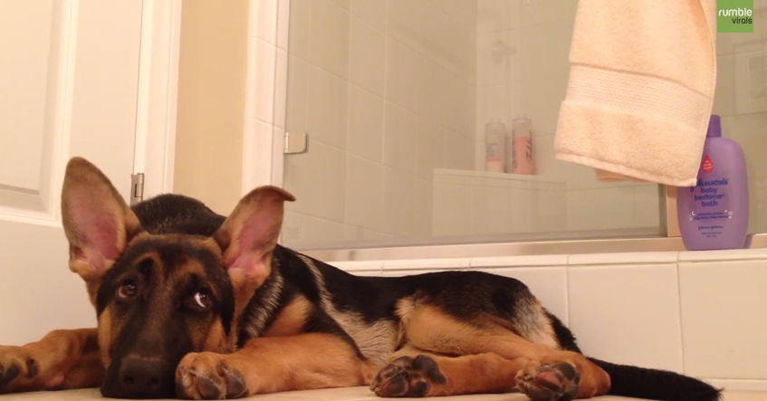 Hundi leiðist söngur húsbóndans í sturtu