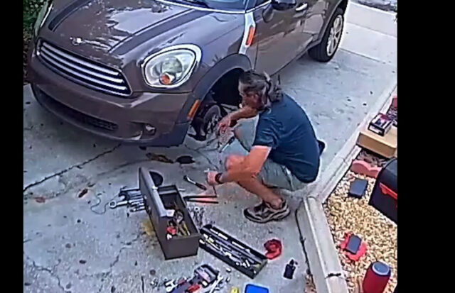 Í þessu myndbandi má sjá mann vera að gera eitthvað við bremsurnar í bílnum sínum. Myndavélin sem tekur þetta upp er sú sem snýr að bílastæðinu hans og er væntanlega öryggismyndavél. Í bakgrunni má heyra einhvern kalla á hjálp.