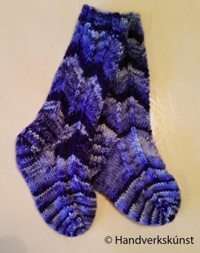 Ég sá sokka með þessu munstri á Ravelry. Mér þykir þetta munstur alltaf skemmtilegt og ákvað að prjóna barnasokka með þessu munstri. Með því að breyta grófleika garns og nota fínni eða grófari prjóna getur þú fengið mismunandi stærðir af þessum sokkum, breytir bara lengd á fæti eftir því sem hentar verðandi eiganda.