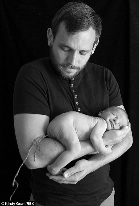 Þó varð sú raunin þegar Al nokkur Fergusson (26 ára) og unnusta hans, Jen, mættu galvösk með nýfæddan son sinn til ljósmyndara fyrir skemmstu, en nýfæddur drengurinn varð skyndilega bísperrtur, greip þéttingsfast í handlegg föður síns og skeit eins og hann ætti lífið að leysa beint út í loftið.