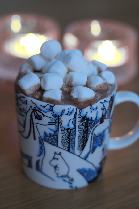 Setjið allt nema sykurpúðana í pott og hitið á meðalháum hita þar til vel blandað/bráðið og hrærið vel í allan tímann. Hellið síðan um ½ bolla kakó, setjið sykurpúða á milli, svo aftur kakó og aftur sykurpúða og njótið.