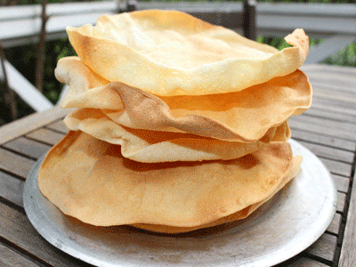 Grænmetinu og kjúklingnum raðað fallega á disk. 4 pappadums skífur eru settar á disk í örbylgjunni og steikar á HIGH í um 30 sec. eða þar til þær púffast út, já, ég sagði púffast. Endurtekið þar til allar eru steiktar.