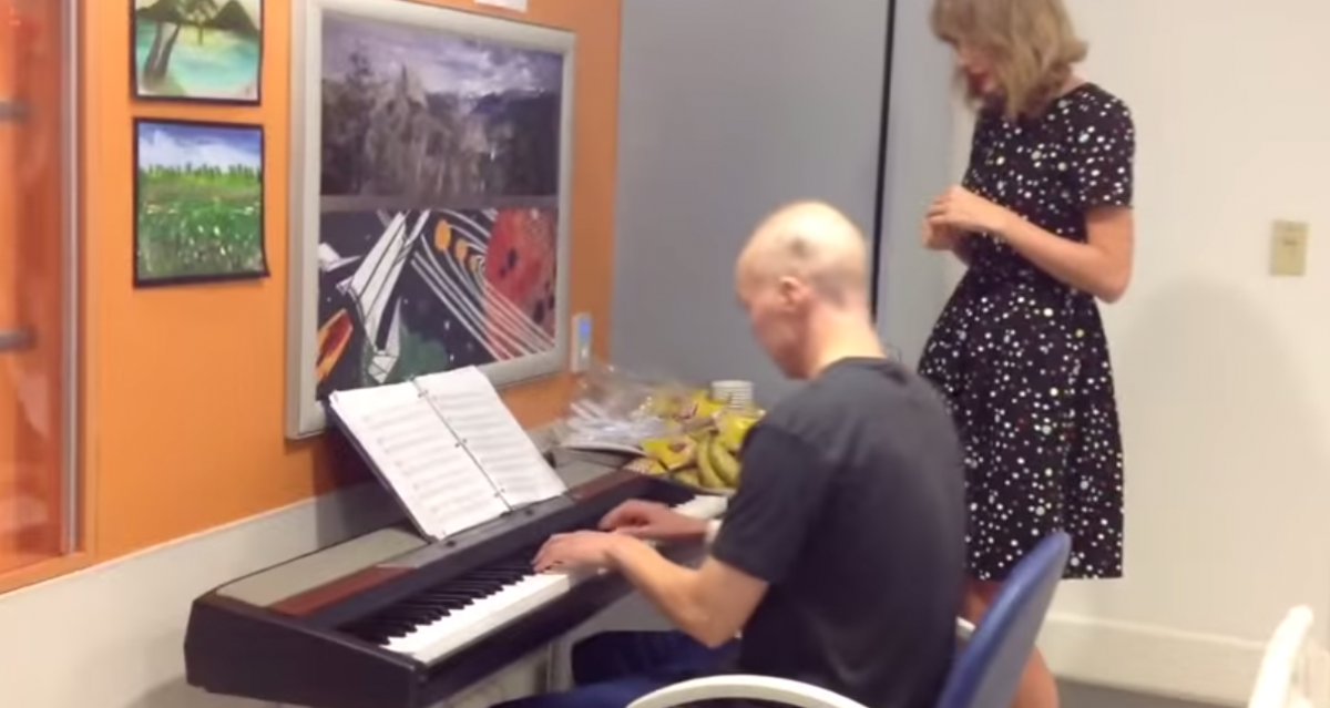 Taylor Swift stoppaði aðeins hjá honum til að segja hæ og óska honum góðs gengis. Þá tók hún eftir hljómborðinu og bað hann um að spila á það og hún myndi syngja ef hún kynni textann. Hér getið þið séð Taylor Swift syngja brot af lagi Adele, Someone Like You.
