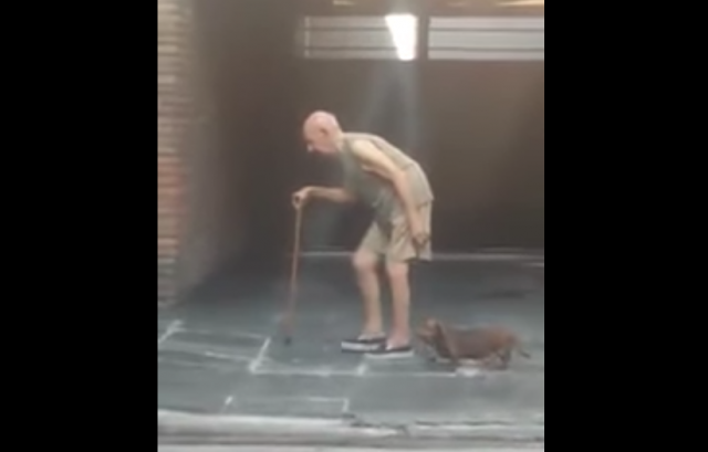 Ég veit eiginlega ekki hvort er fallegra, að gamli maðurinn fer út að ganga með hundinn sinn, þrátt fyrir augljósa líkamlega erfiðleika. EÐA að hundurinn labbar löturhægt til að fara ekki fram úr eiganda sínum.